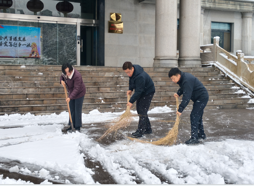 全体干警服从指挥、凝心聚力、统一行动,迅速携带铁锹、扫帚等工具,科学划分小组、明确分工协作,重点对机关院落、办公通道及部分街道等区域开展全方位清扫。检察长带头顶风冒雪、不畏严寒,挥锹铲雪,默契配合、奋勇争先,任凭双手冻红、额角凝霜,始终坚守一线、攻坚克难,不放过每一处积雪死角,不遗留每一块结冰隐患,用汗水打通群众出行“安全通道”。